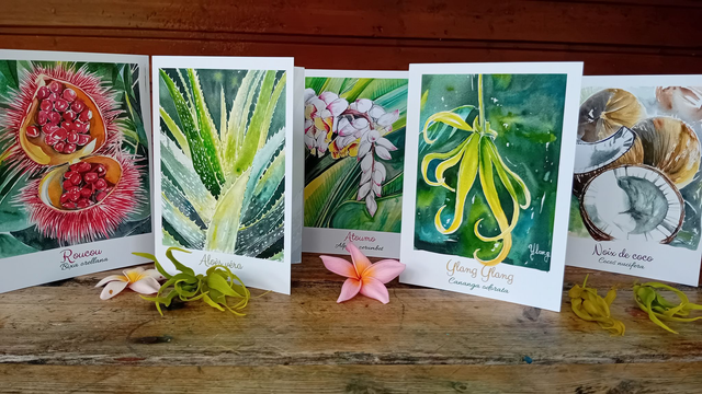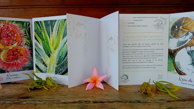 carte botanique, reproduction d'aquarelle sur les plantes du jardin créole format double 13*18cm,